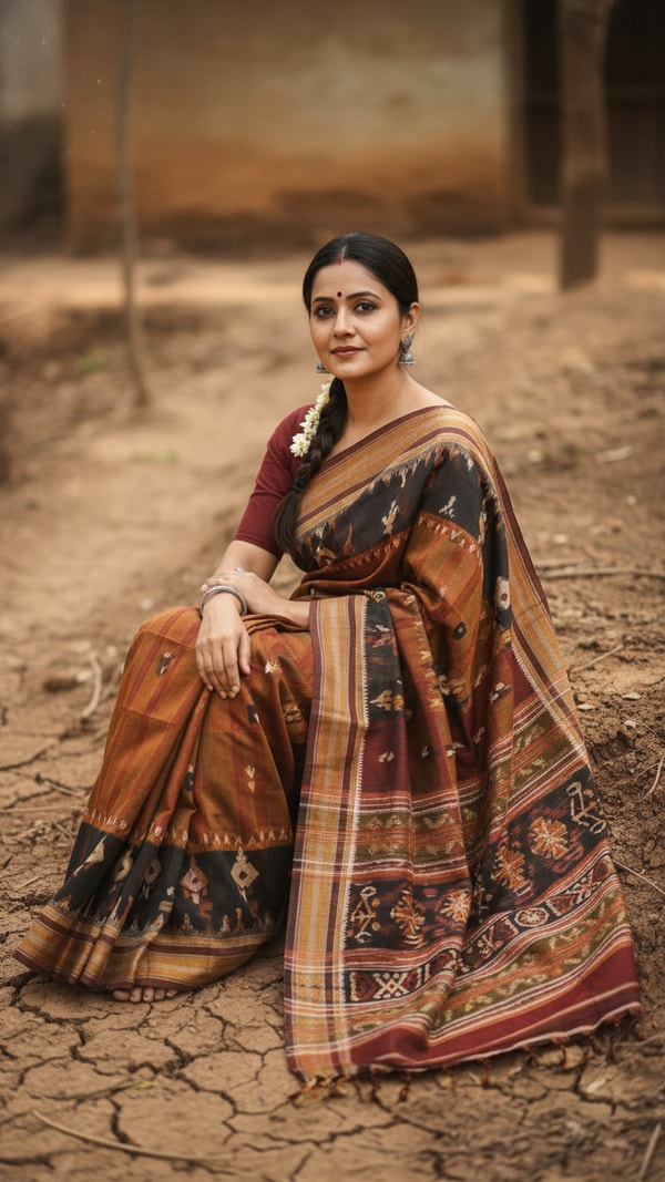 Discover a stunning image of an adult person in a traditional Kotpad saree, seated on the ground amidst an earthy, natural setting, showcasing Odia tribal craftsmanship.