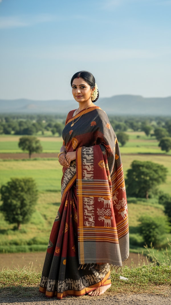 Experience the beauty of a traditional Molakalmuru saree, adorned with unique tribal patterns, as worn by an adult person in a serene, open rural landscape of Karnataka.