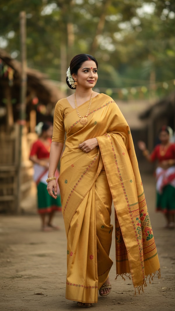 Discover the exquisite beauty of Assam with this image featuring an adult person draped in a radiant golden Muga silk saree during the lively Bihu festival. Perfect for showcasing traditional Indian attire and cultural celebrations.