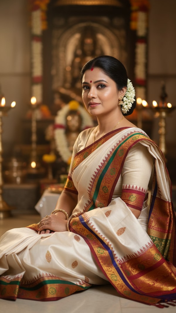 Browse an image of a person in a traditional white Pat Silk saree with vibrant borders, seated respectfully in a religious ceremony. Captures serene Indian cultural fashion and devotional attire.