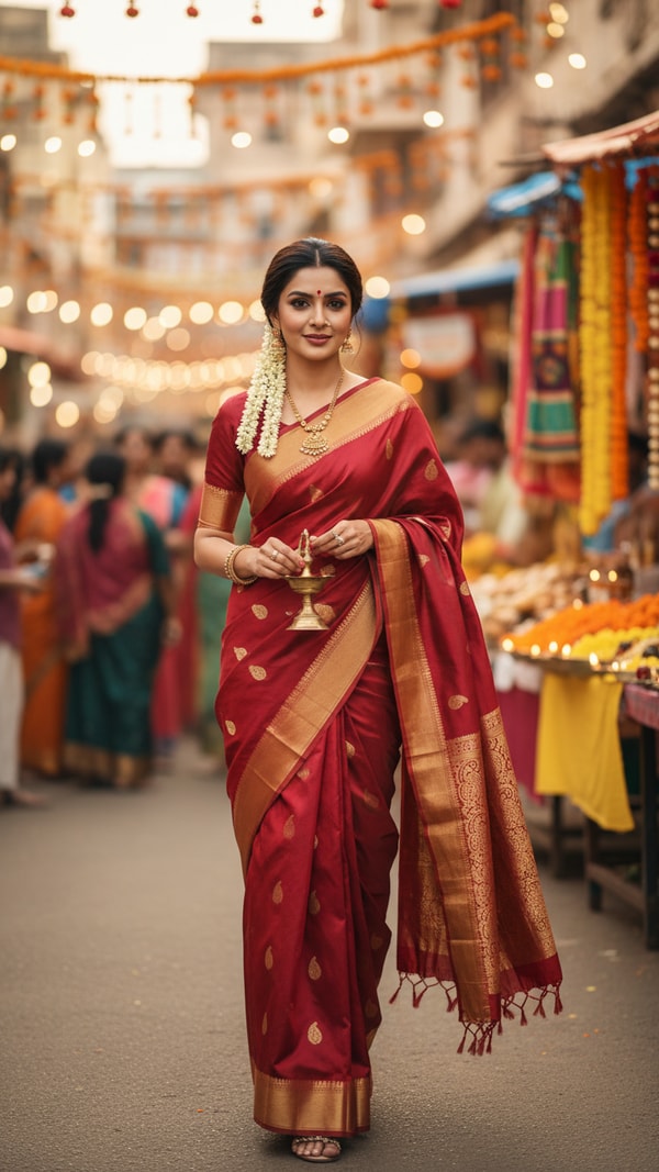 Experience the beauty of an Indian festival with an adult person in a radiant Silk Cotton saree. This photorealistic image showcases traditional elegance and festive charm, perfect for cultural fashion.